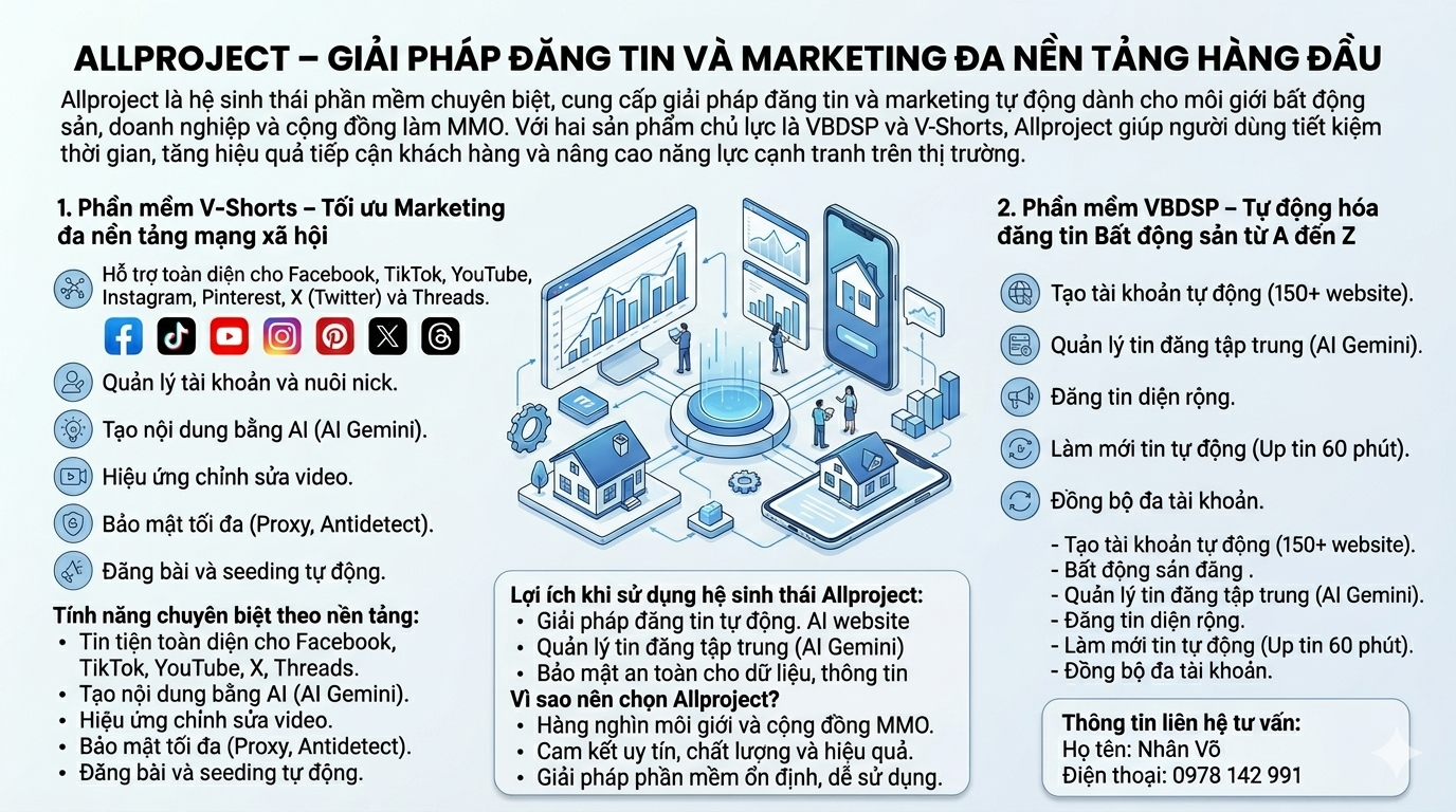 Allproject là hệ sinh thái phần mềm chuyên biệt, cung cấp giải pháp đăng tin và marketing tự động dành cho môi giới bất động sản, doanh nghiệp và cộng đồng làm MMO. Với hai sản phẩm chủ lực là VBDSP và V-Shorts, Allproject giúp người dùng tiết kiệm thời gian, tăng hiệu quả tiếp cận khách hàng và nâng cao năng lực cạnh tranh trên thị trường.